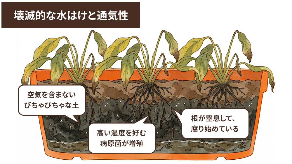 根腐れは多くの場合、水はけが悪く、常にべちゃっと湿った通気性の悪い土で発生します。水で満たされ通気性が悪い土の中で、根は十分な酸素を取り込めず、酸欠状態に陥ります。窒息して著しく弱ってしまった根は、土の中にいる菌の格好のエサとなり、結果として根腐れという致命的な症状を引き起こし、その植物は枯れてしまうのです。