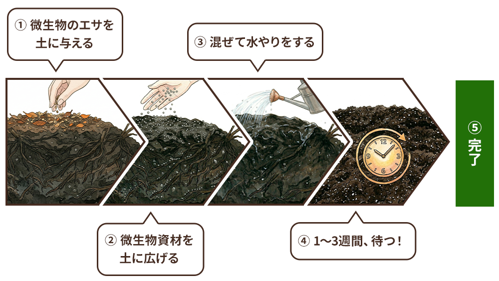 微生物資材がいかに魅力的か、ご理解いただけたはずです。では、実際に微生物資材を使う場合、どのような工程があるのでしょうか。手順表を見て、どれだけ手間の少ない手法であるか実感してみましょう。