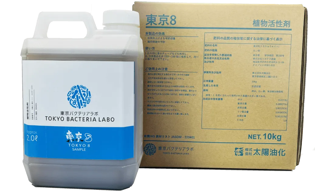 「TOKYO8」は持続可能な地球環境、サステナブルな有機農業への期待が高まる中、資源循環から生まれた植物活性用バクテリア製剤です。最大の特徴は、1400種類以上という多様性を誇るバクテリア群です。これらが土中の緑肥や堆肥、前作の残渣(ざんさ)といった有機物の分解を加速させ、土壌環境を根本から改善します。有機JAS資材登録済みのため、プロの有機栽培でも安心してお使いいただけます。